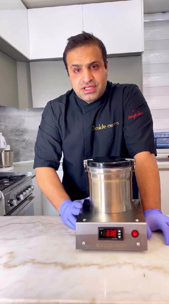 Usage of «silk« is very convenient, especially for fast tempering of the small chocolate batches. Just fill the incubator with cocoa butter and keep it at the stable temperature of 32.7ºC.