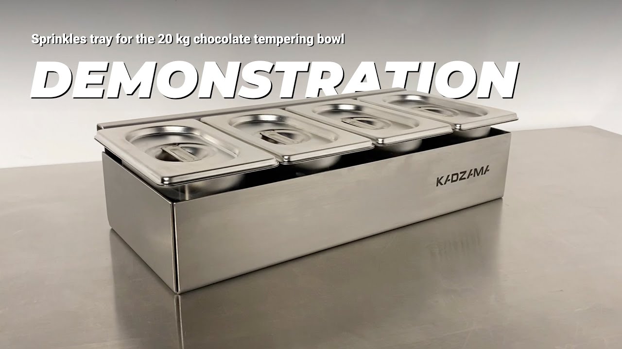 We know that our clients love to work not only fast, but also with comfort. We have amazing news — no more need to choke up the useful working surface with bowls and containers full of nuts & sprinkles while making the chocolate bars. The sprinkles tray, made specially for a 20 kg chocolate tempering bowl, can hold exactly 4 standard GN 1/9-100 gastro containers, which allow you to work with different dressings at the same time. Fill the mold with chocolate, evenly route it in the mold and kick off air bubbles via a vibrating table, sprinkle, repeat.